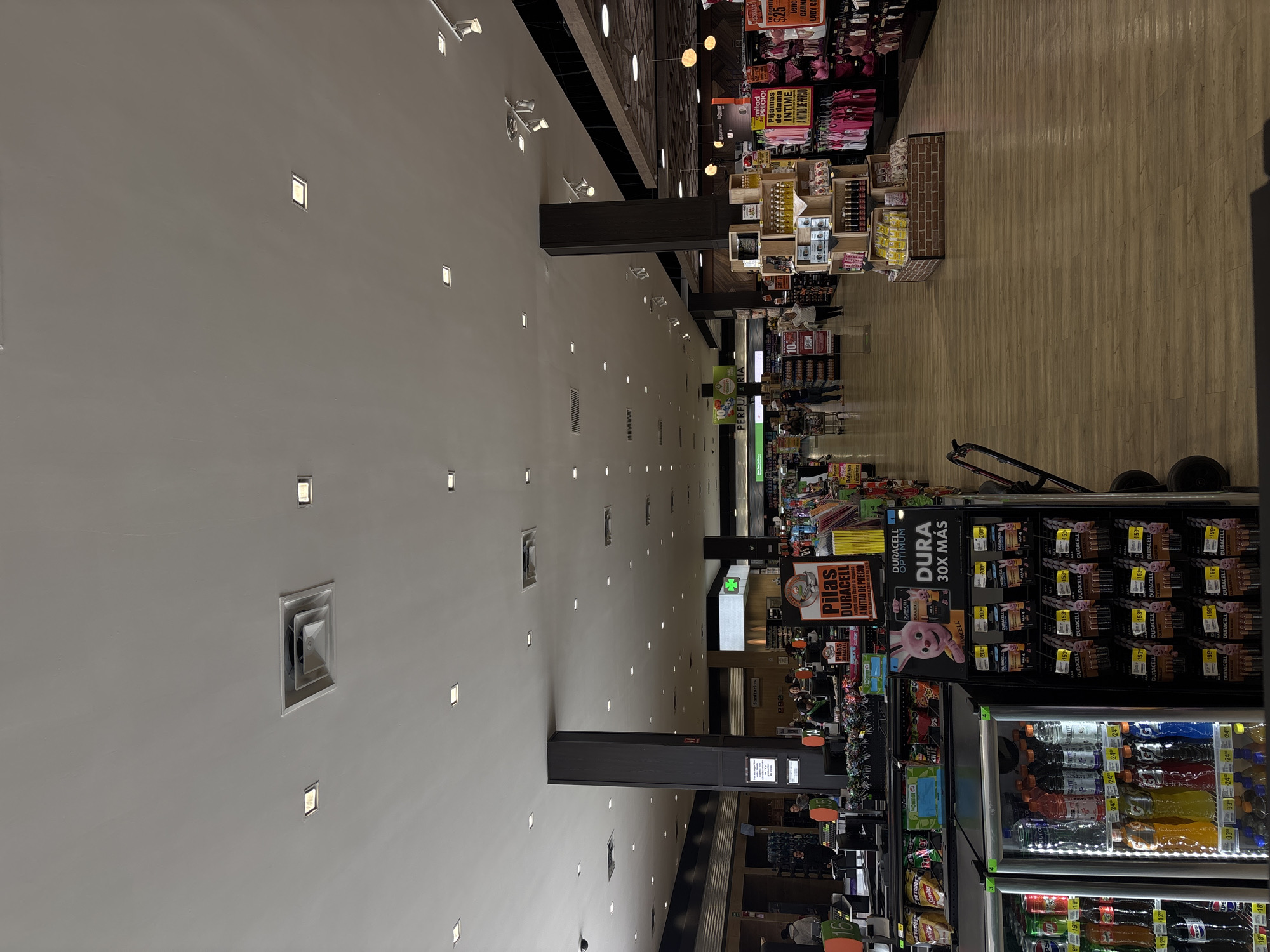 interior of a supermarket, seemingly taken from an elevated perspective. The supermarket features a high ceiling with numerous recessed lights and air conditioning vents. There are product aisles with shelves stocked with various items, including food and household products. At the bottom of the image, a refrigerator unit displays a variety of beverages. Several signs and advertisements are visible, some written in Spanish. The supermarket appears to be well-lit and organized. The picture was taken in Heroica Puebla de Zaragoza, Mexico.