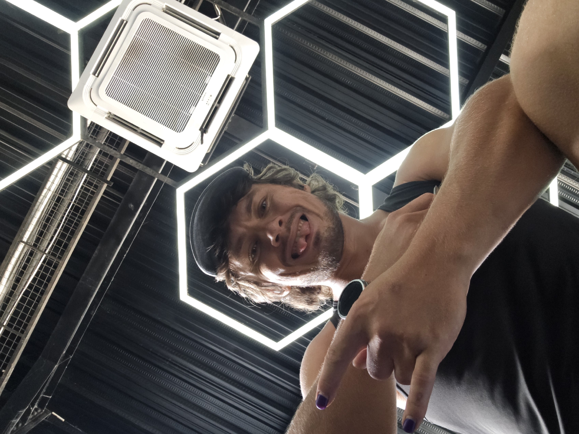 The photograph is taken from a low angle, looking up at a man wearing a black baseball cap and a black t-shirt. He has light brown hair and a beard and is sticking his tongue out, smiling. He is pointing down with two fingers, both of which have purple nail polish. A black watch is visible on his wrist. The ceiling features a white air conditioning unit and illuminated hexagonal light fixtures against a black background with horizontal lines. While I cannot verify the specific location, the image is identified as being in Tibubeneng, Indonesia.