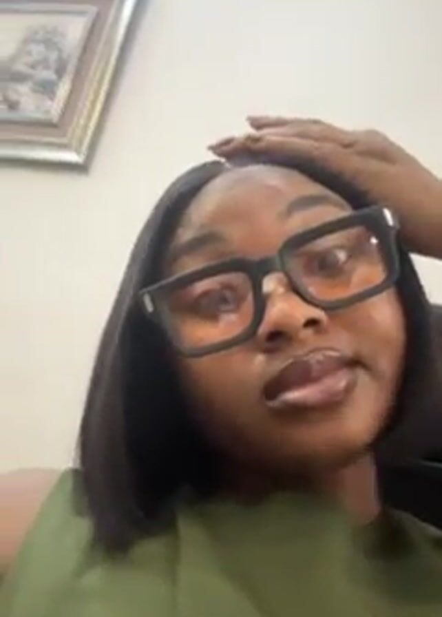 A woman with dark skin, wearing black-rimmed glasses and a green top, looks directly at the camera with wide eyes. She has short, dark hair styled in a bob. Her right hand is on her head, and another person’s hand briefly appears near her head. In the background, a framed picture hangs on a light-colored wall.