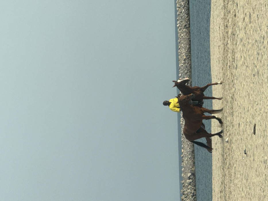 Two brown horses are racing on a dirt track adjacent to water. A jockey in a bright yellow shirt rides the lead horse. The second horse follows closely behind. The water body runs alongside the track, separated by a thin strip of pebbles. The rest of the sky is light blue.