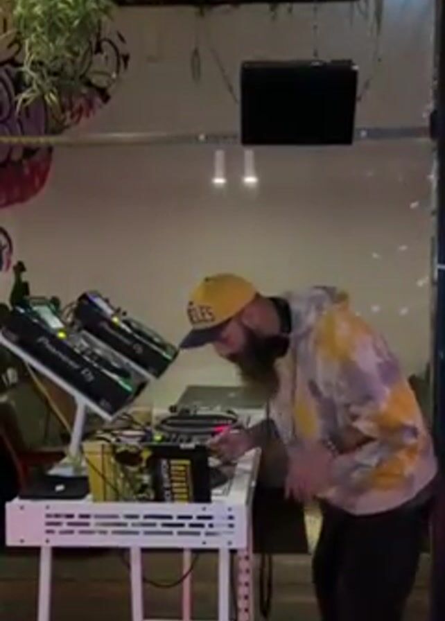 A DJ in a yellow baseball cap, tie-dye hoodie, and black pants works at a white DJ console in an outdoor setting