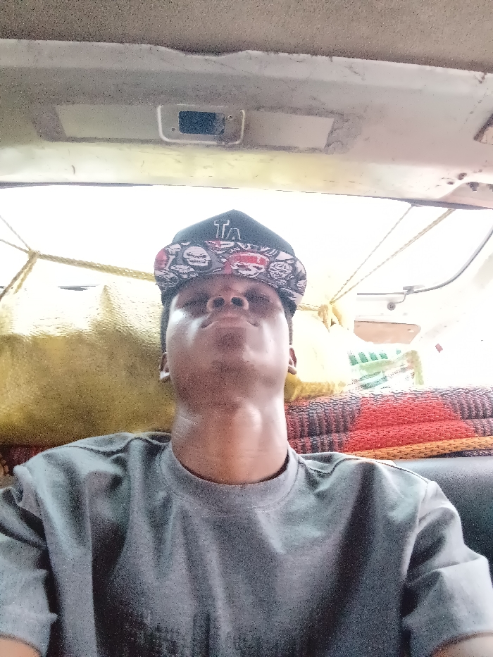 A man in a gray t-shirt and a black and red baseball cap is looking up towards the camera. He appears to be inside a vehicle with items such as bags and rolled mats behind him. The vehicle's interior has a light-colored, textured ceiling with a small rectangular opening. The overall lighting is bright, but the subject is somewhat in shadow due to the angle and position of the camera.