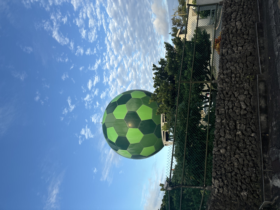 The image displays a prominent, large spherical structure, resembling a green and dark green paneled soccer ball, situated in Hengchun, Taiwan