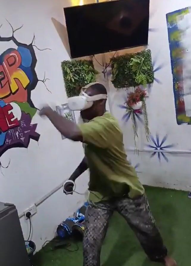 A man wearing a VR headset, a green t-shirt, and patterned pants is playing a virtual reality game in a room decorated with graffiti, artificial plants, and a television. He is holding controllers in both hands and making punching motions, immersed in the game. The room is small and features artificial turf flooring.