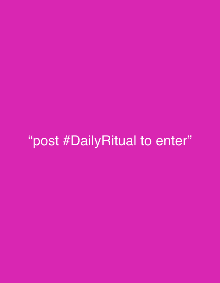The image displays a flat, uniform magenta background. Positioned centrally in the lower portion of the frame is white, sans-serif text enclosed in quotation marks, stating: "post #DailyRitual to enter". No other subjects, objects, people, or environmental features are present. The image does not depict any identifiable physical location within the city of Sofia, Bulgaria, or anywhere else; it is a digital graphic composed of text on a solid color field. There are no actions or interactions depicted.