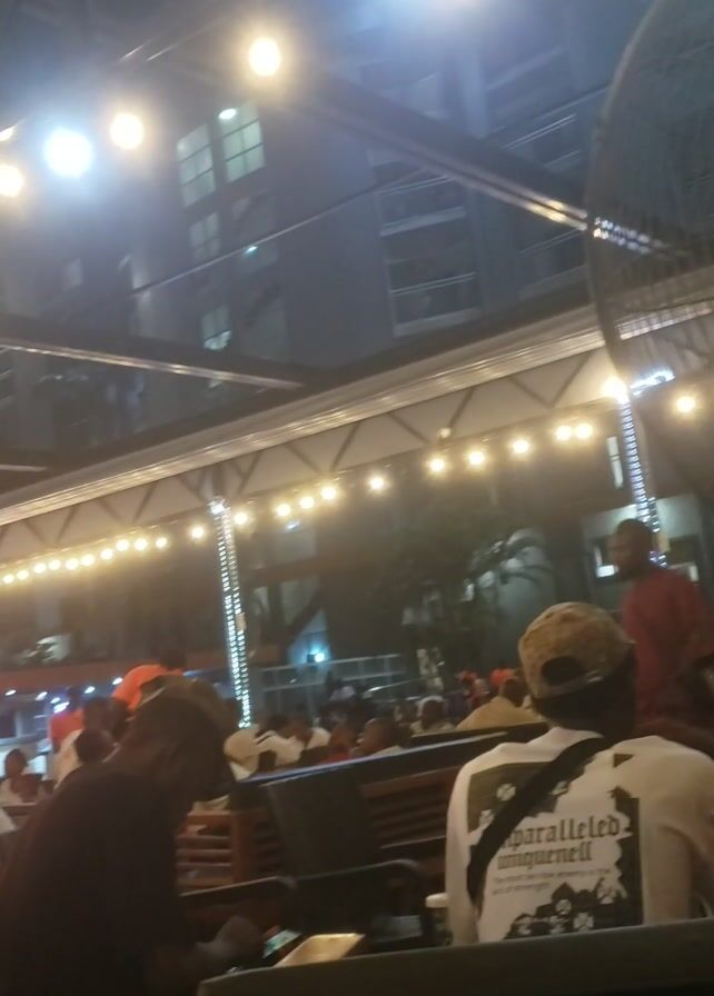 The video depicts a crowded outdoor restaurant or bar area at night, with the camera angled upwards towards a canopy-like structure adorned with rows of string lights. Below, patrons are seated at tables, mostly visible from the back, suggesting they are watching something towards the front. A large screen shows a brightly colored image, possibly a video game or sporting event. The atmosphere appears lively and social.