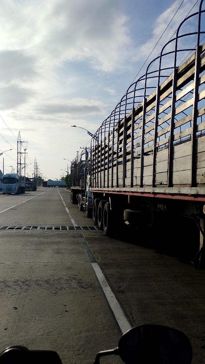 A row of large trucks with caged cargo beds is parked on a paved road. The road stretches into the distance, lined with power lines and streetlights. The sky is overcast with a mix of bright and dark clouds. The view is from a low angle, possibly from a motorcycle, with a side mirror visible in the foreground. The lighting suggests either early morning or late afternoon.