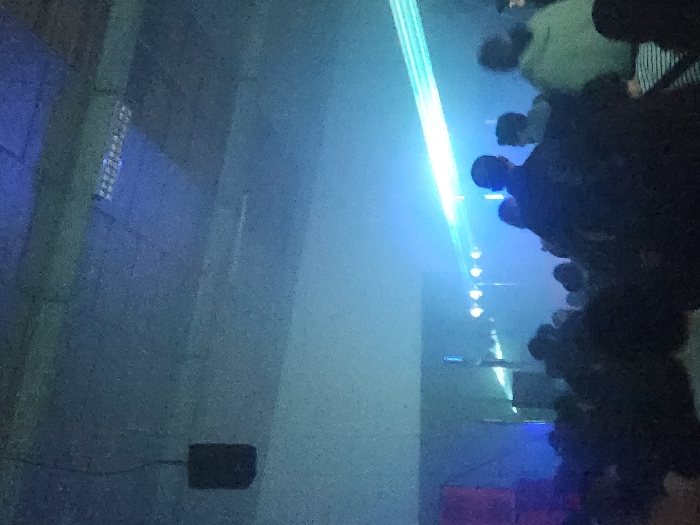 A dimly lit, hazy indoor setting features a crowd of people on the right side. A bright green laser beam cuts across the space, intersecting with the crowd. The left side shows a gray wall with visible architectural details like ledges and a strip of what might be lights. A small, dark object is affixed to the wall closer to the bottom. The overall atmosphere suggests a club or concert venue.