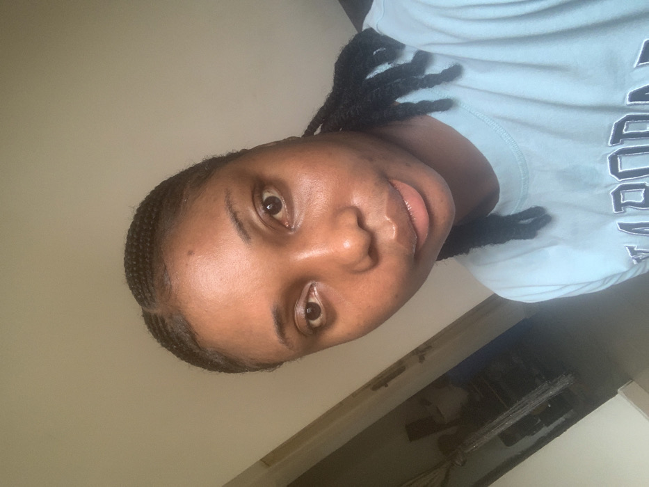 The image displays a close-up, head-and-shoulders shot of an adult female with dark skin, centered in the frame