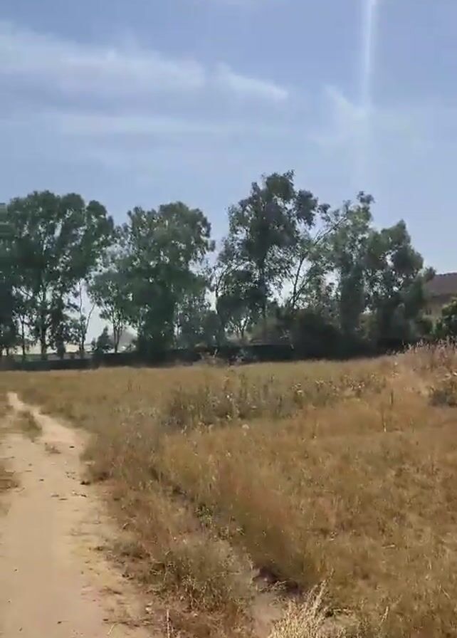 field of dry, brown grass under a bright blue sky with scattered clouds. In the first shot, some trees and the roof of a building are visible in the distance. The perspective then changes to show a dirt path running through the field. More trees are visible along the horizon. The video appears to be taken by someone walking or moving along the path.