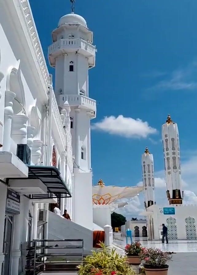 n external view of the white Amirul Mukminin Mosque in Parepare, Indonesia, under a bright blue sky with fluffy clouds