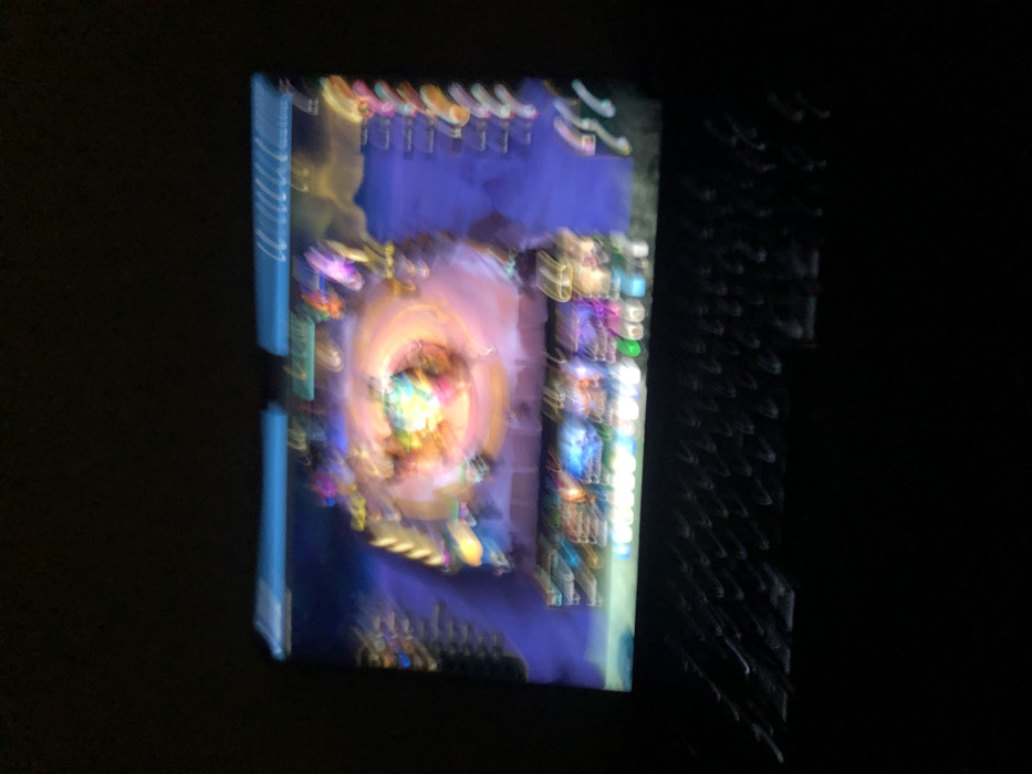 This scene is located indoors in Beccar, Argentina. A laptop computer occupies the central and lower portions of the frame, displayed in a dimly lit environment where its screen is the primary light source. The laptop's keyboard is visible in the foreground, illuminated softly by the screen but rendered blurry. The screen itself displays an active video game, characterized by a vibrant, swirling central area of multiple blurred colors, suggesting an ongoing in-game event or ability. Interface elements, including what appear to be health bars, unit icons, and game information, are indistinctly visible along the edges and bottom of the game display. The surrounding environment is predominantly dark, indicating minimal to no ambient lighting. The entire image exhibits significant blur, preventing the clear identification of specific details on the screen or keyboard. No individuals are present in the visible frame.