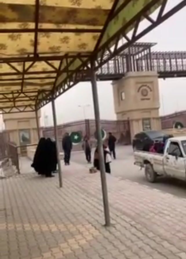 people walking on a paved area towards a guarded gate with Pakistani flags and the words "FRIENDSHIP GATE TAFTAN". A white pickup truck is parked on the right side of the paved area. The scene is viewed from under a covered walkway. The sky is overcast. Some of the people are wearing traditional Islamic clothing.