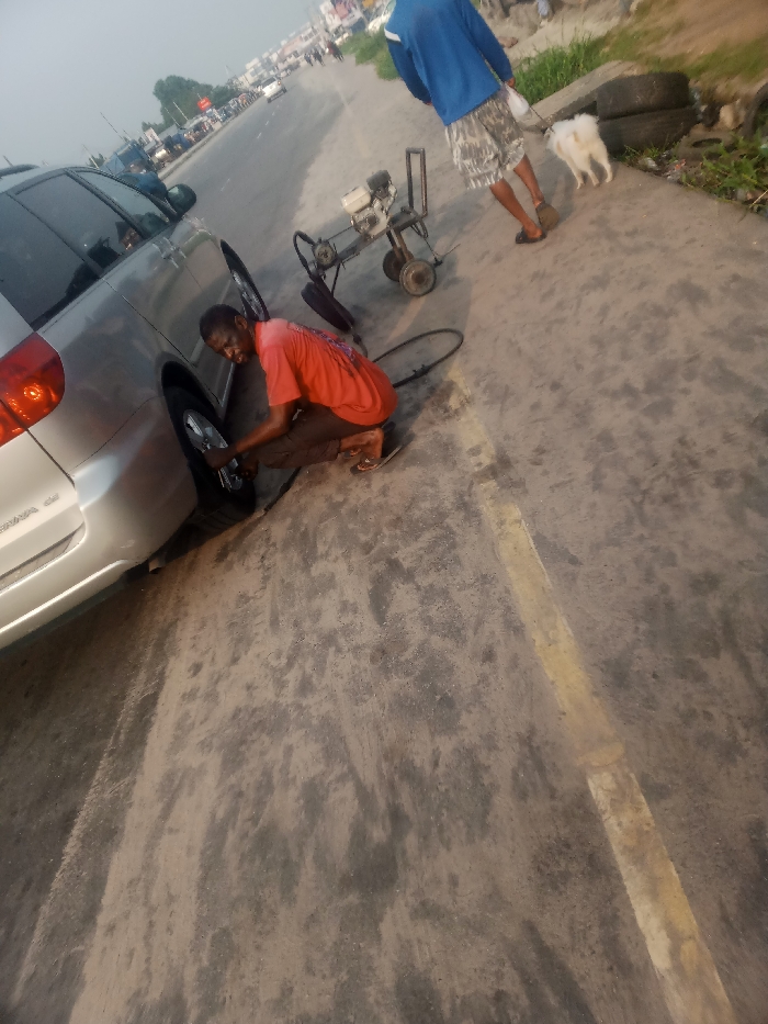 A man in a red shirt is crouched down, working on the tire of a silver minivan parked on the side of a road. A portable air compressor sits nearby, connected to the tire with a hose. Another man in a blue shirt walks away, holding a leash attached to a small white dog. Used tires are piled behind them. The road stretches into the distance with vehicles visible in the background.