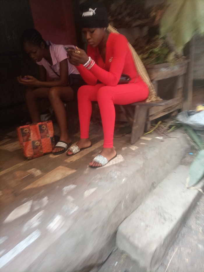 Two young women are seated on a bench, both using their phones. The woman on the right wears a red jumpsuit, black Puma beanie, and sparkly sandals. She also has long, blonde hair. The woman on the left wears a pink collared shirt and black and white striped sandals. A patterned orange and brown bag sits next to her. The setting appears to be an outdoor public space.