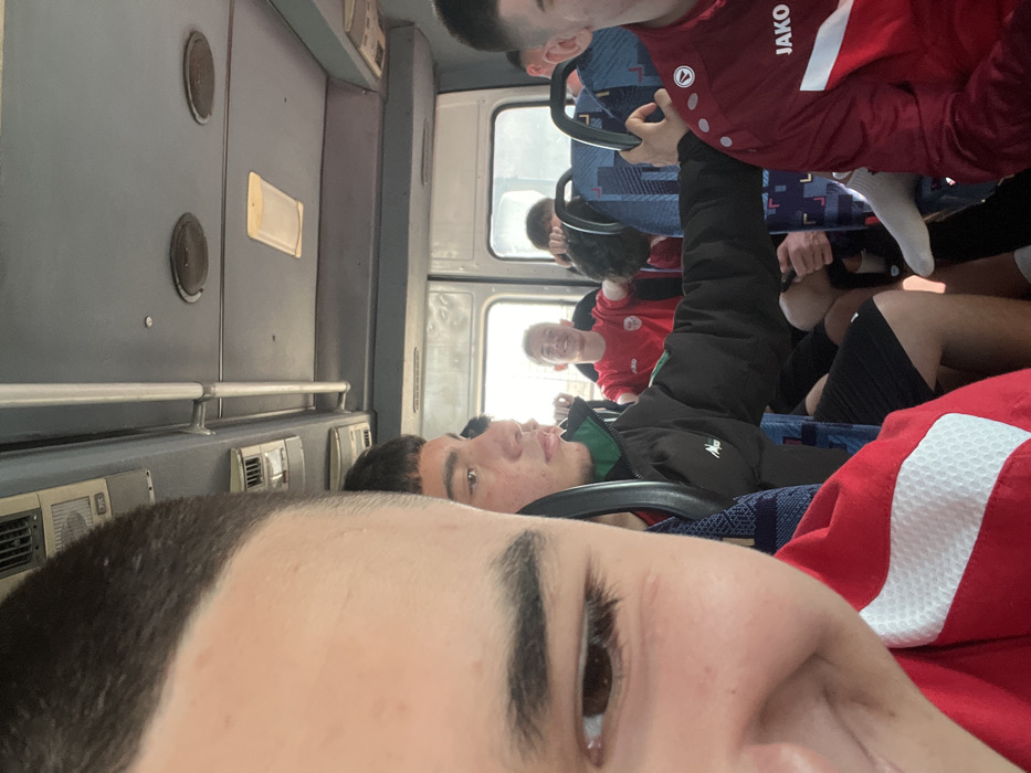 The image depicts the interior of a passenger vehicle, likely a bus or large van, observed in what is understood to be the city of Banya, Bulgaria. This particular scene occurs during daylight hours. Multiple young males are seated within the cabin. The foreground features a close-up, partial view of a young male's face, specifically his right eye, eyebrow, and the right side of his shaved head. He exhibits a subtle upward curve to his mouth. He wears a red garment with a white textured stripe on the upper right arm or shoulder. Immediately behind him and to the left, another young male, with dark hair and a short fringe, is visible. He is dressed in a black jacket featuring a green interior collar and a light-colored logo on the left chest. His right arm extends forward, with his hand resting on the backrest of the seat in front of him. To the far right of the frame, a third male is partially seen, wearing a dark red sports jacket with white accents and the "JAKO" brand logo prominently displayed on the chest. Further back in the cabin, a young male with short, light-colored hair smiles towards the camera, his arms outstretched, hands gripping the backrests of the seats flanking him. He wears a red short-sleeved shirt with a white circular emblem on the chest. Another male, mostly obscured behind the individual in the black jacket, has dark curly hair and is also holding onto a seat back. Other passengers are partially visible, indicating a fully occupied vehicle. The interior of the vehicle is characterized by light grey ceiling and walls. Overhead storage racks, ventilation grilles, and a rectangular ceiling light fixture are present, along with a continuous metal grab bar. The seats are upholstered in a blue fabric with a repeating geometric pattern. Bright ambient light enters through multiple windows, suggesting an outdoor, daylight environment, though no specific external landmarks confirming the location within Banya, Bulgaria, are visible from this internal perspective. The attire of several individuals, particularly the sportswear, suggests they may be part of an athletic team or organized group.