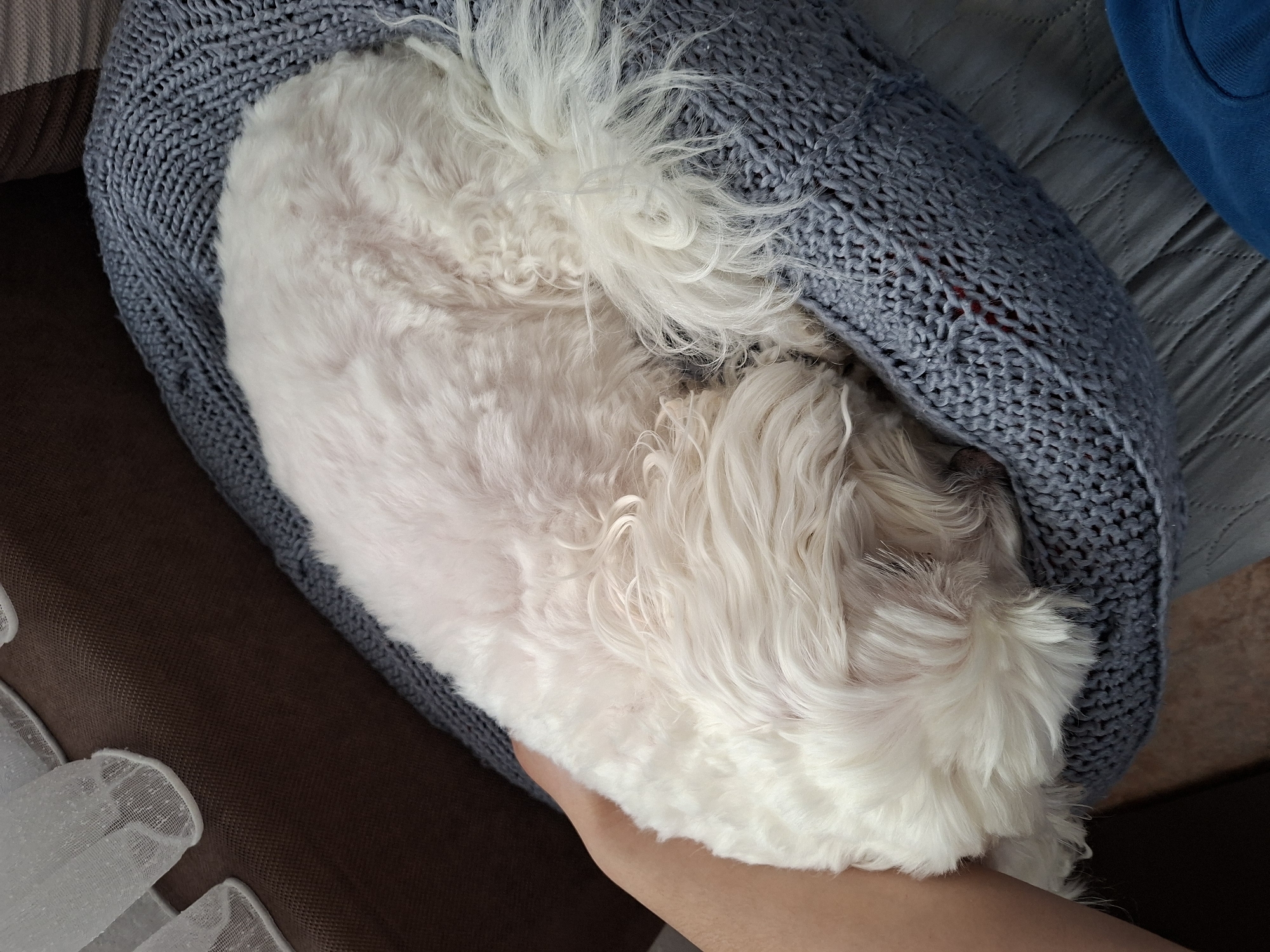 - "A white, fluffy, small dog curls within a knitted blue pet bed, which rests upon a tan upholstered surface, possibly a couch" by FM-iKbEw2, licensed under CC BY 4.0