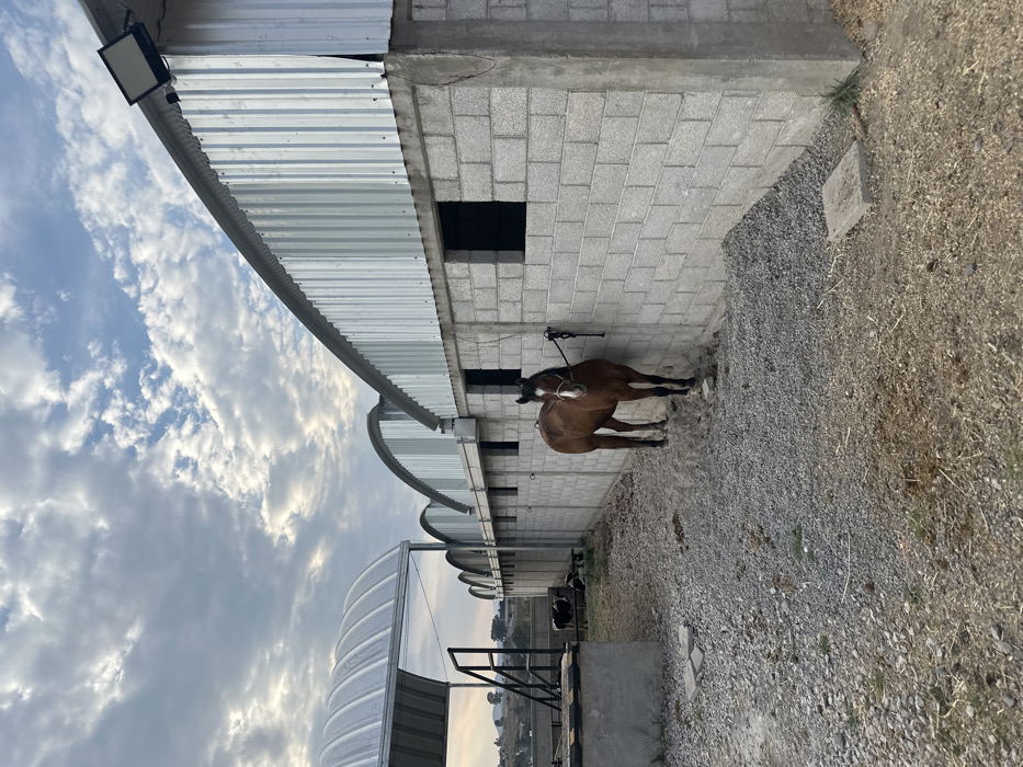 A brown horse with white markings stands tied to a building made of concrete blocks and a corrugated metal roof. The building has dark openings. The ground is covered in gravel and dry grass. The sky is filled with gray clouds. The scene is oriented vertically, with the building and horse positioned along the top half.