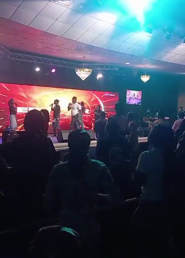 A band is playing on stage in front of a crowd. The stage has a large video screen behind the band. The lighting changes colors, from green to blue to purple. People in the crowd are dancing and clapping. The room has chandeliers and a drop ceiling.