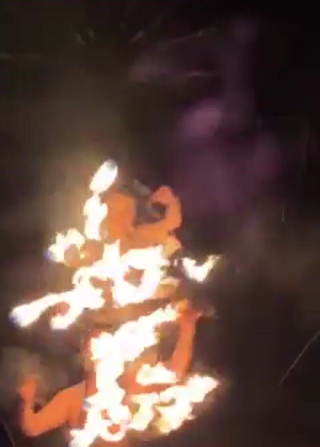 Two women are performing a fire show at night