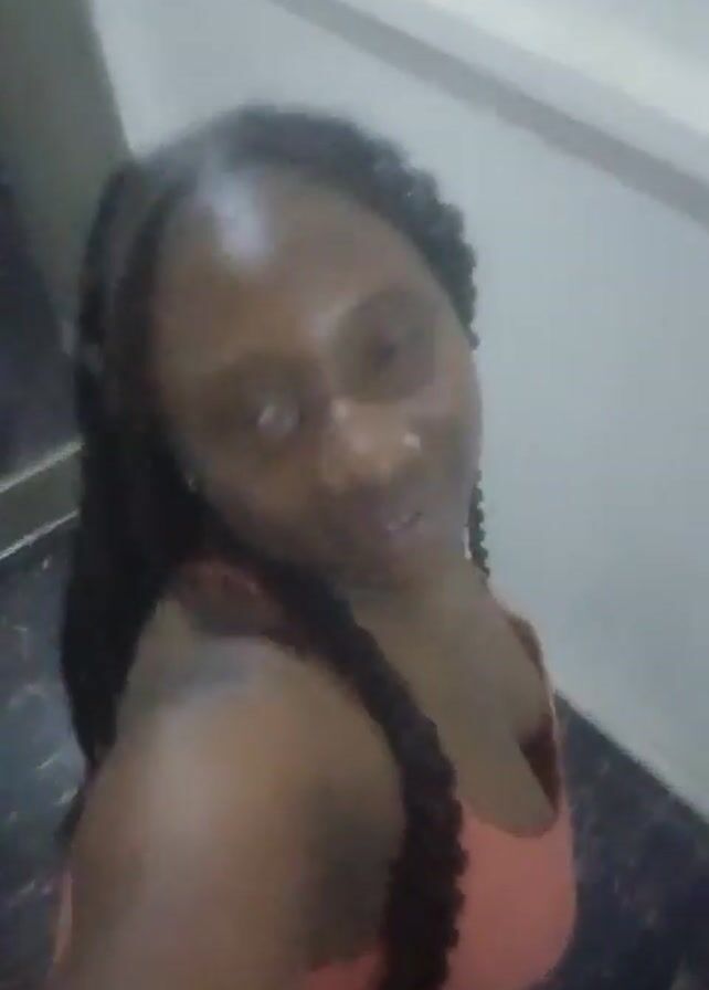 A woman with dark skin and long, dark braids is recording a selfie-style video. She is wearing a light-colored tank top. She is standing in what appears to be a hallway. Her hair is slightly pulled back from her face with a clip. She is looking directly at the camera and smiling. There are white walls and a dark floor. A door is visible in the background. The video is a bit shaky, suggesting she is holding the camera herself. Loud music is playing in the background. She runs her hand through her hair.