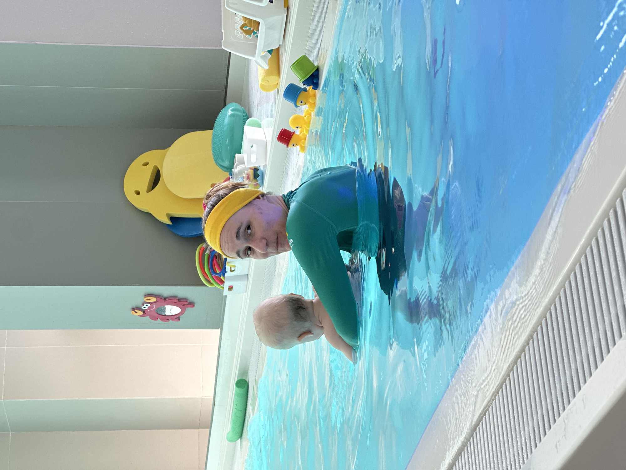 In Khimki, Russia, an adult female wearing a yellow headband and a green long-sleeved rashguard is in a swimming pool with a baby. The adult is supporting the baby in the water. Various colorful plastic toys are visible along the poolside. The pool's water is clear and blue. The poolside edge is white and has a drainage grate. The walls are painted in neutral tones. A red crab decoration adheres to the wall.