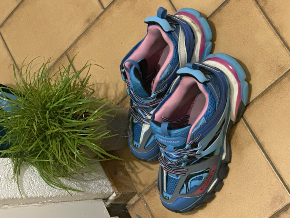 In an interior setting within Villaz, Switzerland, a pair of Balenciaga Track sneakers is positioned on a light brown tiled floor