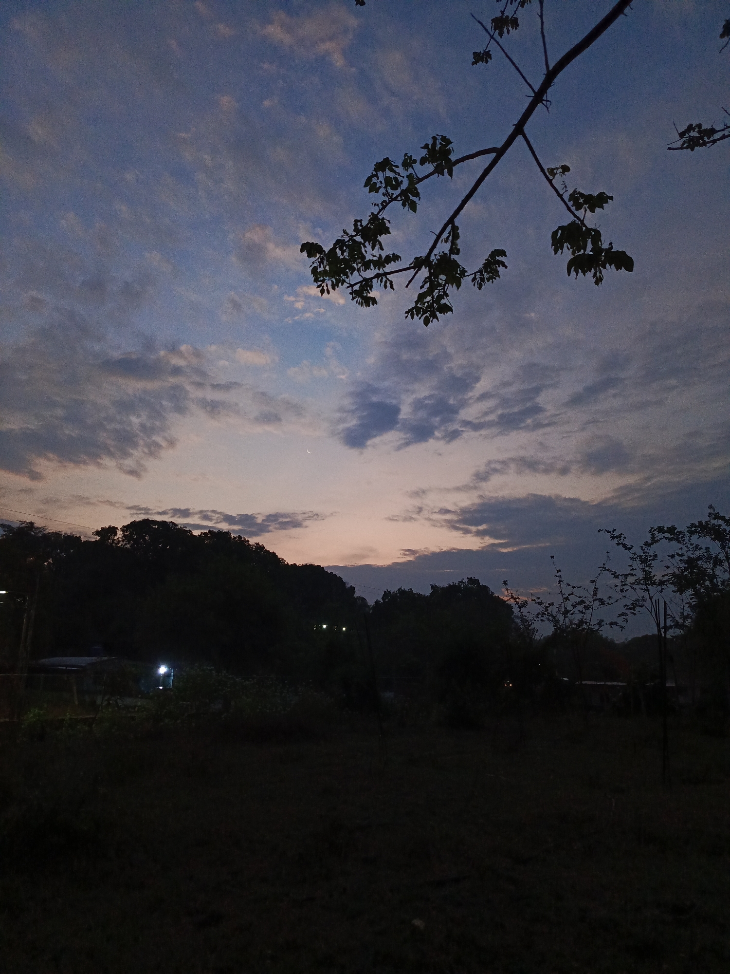 The image depicts a landscape at dusk, possibly located in the city of Monagas, Venezuela. The foreground is dominated by a dark, unidentifiable field. In the midground, there is a treeline with dense foliage, silhouetted against the twilight sky. A few faint lights are visible, possibly from buildings or structures, on the left side of the treeline. Above the treeline, the sky transitions from a deep blue to a soft orange and pink hue, with scattered clouds. A crescent moon is visible in the upper-middle portion of the sky. In the upper right portion of the image, tree branches with leaves extend from the top, partially obscuring the sky. There are no people visible in the image.