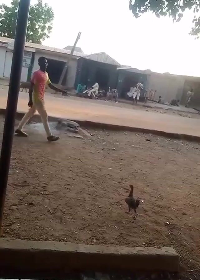daytime outdoor scene in a somewhat rural or developing area. A brown chicken is walking on a dirt ground in the foreground. In the background, across a paved road, are a row of low, simple buildings with a mix of architectural styles. People are sitting and standing in front of the buildings. A dog is also walking along the road. A person walks across the scene in front of the chicken. Tree branches and leaves partially obscure the top of the frame. The video is somewhat shaky.