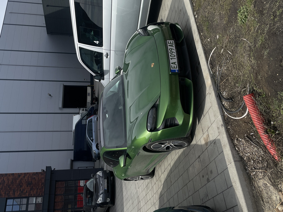 This image displays an outdoor parking area in the city of Bozhurishte, Bulgaria. In the foreground, a dark green Porsche Taycan electric sports car is parked diagonally on light grey rectangular pavers, angled towards the right. It displays a Bulgarian license plate, EA 1099 AE, on its front bumper. To the left of the Porsche, a dark-colored Subaru Outback, bearing Bulgarian license plate CB 0176 PH, is parked facing left on the same paved surface. To the right of the Porsche, a light-colored van, likely silver or white, is partially visible, with a black numeral "4" displayed on its side window. The paved parking area borders a strip of disturbed earth and dry grass in the lower right portion of the image. Within this strip, a segment of red corrugated conduit lies horizontally, accompanied by several exposed black and white electrical cables. The background consists primarily of a large, tall, grey industrial building with corrugated metal siding, featuring a prominent open loading bay. To the far left, a multi-story building with a red brick upper facade and dark-paneled lower section is partially visible. Additional vehicles, including a dark blue panel van, a light blue hatchback, and a white flatbed truck, are parked further in the background between the foreground vehicles and the main industrial structure. The scene is illuminated by natural light under a clear sky.