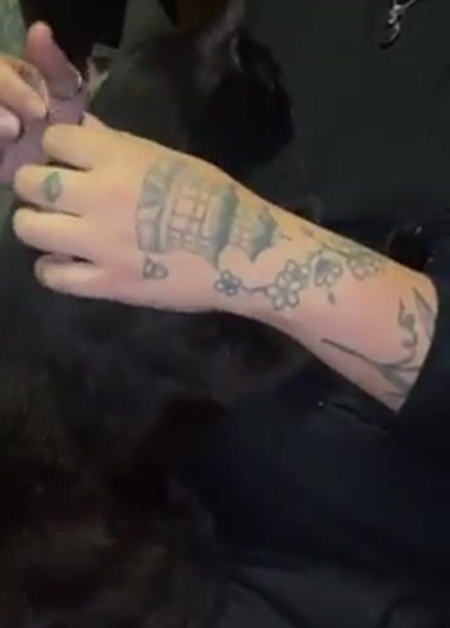 A person, wearing a long-sleeved black shirt and a pendant necklace, sits and pets a black cat. The person’s left arm is heavily tattooed. The background is a dark room with a cabinet visible in the background. The person pets the cat’s head, scratching the back of its ears.