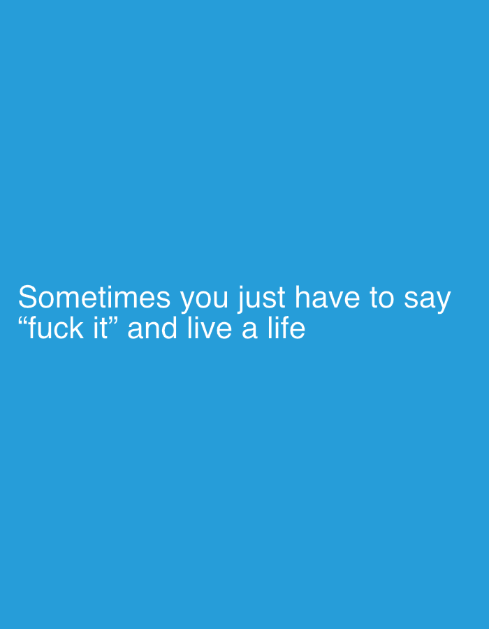 The image presents a vertical rectangular graphic featuring a solid, uniform blue background. Centered horizontally within the lower-middle portion of the frame, white sans-serif text is displayed. The text reads: "Sometimes you just have to say “fuck it” and live a life". The phrase "fuck it" is enclosed in double quotation marks. No people, distinct subjects, physical objects beyond the textual graphic, actions, interactions, or specific environmental features such as architecture or landscapes are depicted within the image itself.