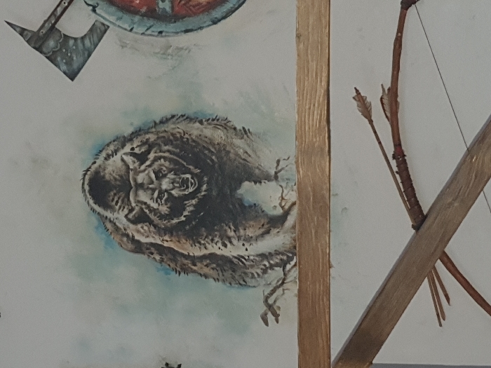A painting shows a curled-up bear with detailed fur, resting on a blue-tinged background. Above the bear is a shield and axe. To the right, a bow and arrow are mounted on a wooden frame. The objects suggest a historical or mythological theme, possibly related to hunting or warfare.