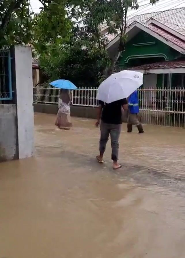 flooded street with people walking through the water. The water is murky and brown. A person in the foreground is walking away from the camera, holding a white umbrella. Another person is walking in the same direction with a blue umbrella. There is also a person in a blue jacket and boots walking through the floodwater. Houses with fences are visible in the background. Trees are visible on either side of the street. It is daytime.