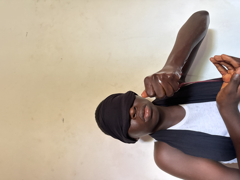 In Ado, Nigeria, a dark-skinned individual is centered against a light beige wall. A black fabric blindfold covers their eyes. They wear a white undershirt, with a black fabric draped over their left shoulder and chest. The individual's right hand is clenched, squeezing a reddish-orange, ovate object, from which a dark red, viscous liquid streams downward. The right hand and forearm are glossy from contact with the liquid. The left hand is cupped below the right, positioned to receive the dripping substance. The individual's lips are slightly parted, maintaining a neutral expression.