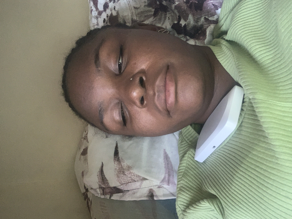 A close-up, high-angle indoor photograph taken in Tempure, Nigeria, depicts an individual identified as female, with dark skin, lying supine