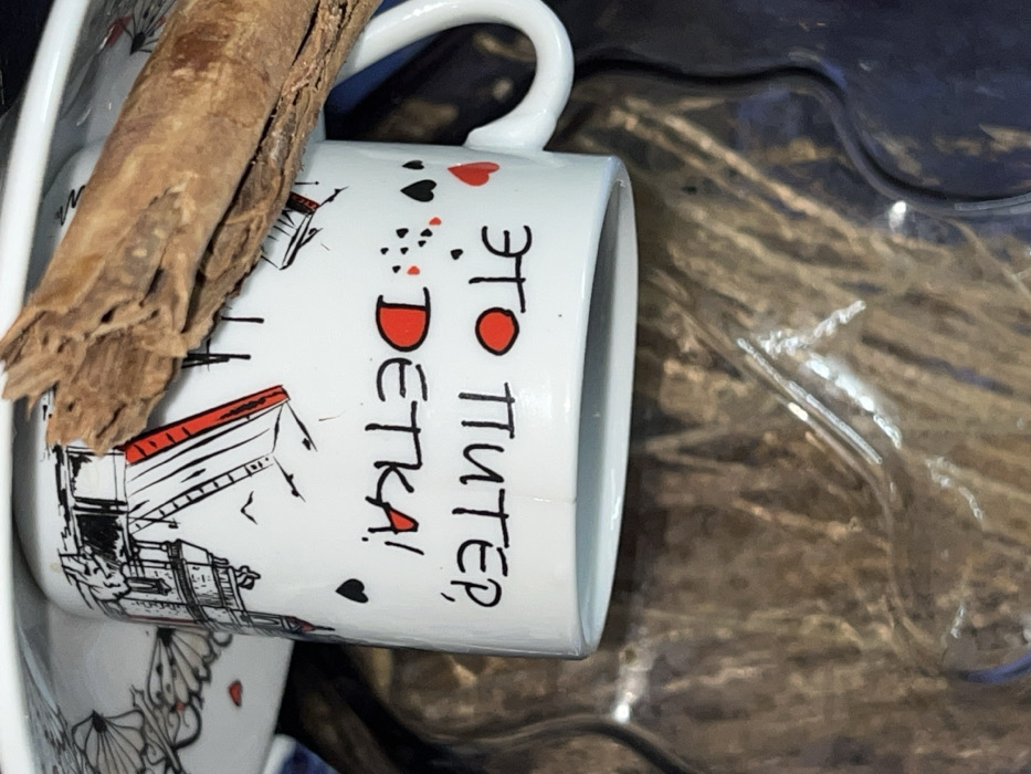 The image displays a white ceramic demitasse cup, filled with a dark liquid, presumably coffee or tea. The cup features Russian text "ЭТО ПИТЕР, ДЕТКА!" (translating to "THIS IS PETERSBURG, BABY!") in black and red lettering, interspersed with red and black heart motifs. Illustrations on the cup depict a raised drawbridge with red underside elements and a classical architectural building, both characteristic of Saint Petersburg, Russia. The cup rests on a white saucer adorned with a black and white floral pattern and small red hearts. A piece of dried, fibrous, light brown wood is positioned on the saucer, leaning against the side of the cup. The background is out of focus, showing a dark, textured, and somewhat reflective surface. This scene does not depict the city of Семибратово, Russia. Instead, the mug's design explicitly references "Piter," a colloquial term for Saint Petersburg, Russia, through its text and iconic architectural illustrations.