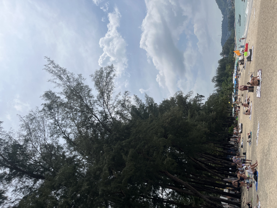 A beach scene presents a row of tall, dark green trees along the shore, casting shadows on the sand. People relax on towels, sunbathing under a partly cloudy sky. The ocean is visible in the distance, with a boat dotting the water. The scene evokes a relaxed, tropical atmosphere.