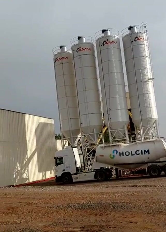 n industrial scene with a large truck and silos, then pans to show a rainbow over a sandy landscape. The truck is white and bears the "Holcim" logo, connected to four tall silos labeled "AMM." A small building is visible nearby. The camera then pans upward to reveal a vibrant rainbow stretching across the sky behind piles of sand, some trees, and a gray car parked in the foreground. The sky is overcast, suggesting recent or ongoing rain.
