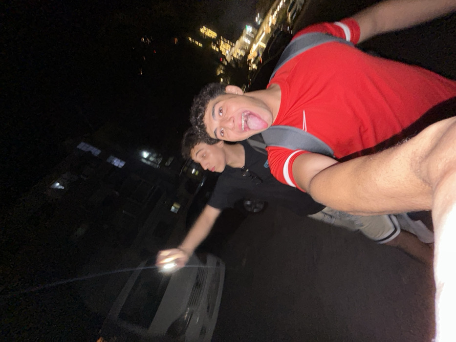 Two young males are depicted outdoors at night in Joubar Municipality, Syria. The subject in the foreground, facing the camera, wears a red short-sleeved shirt with white arm stripes and a grey backpack. He extends his arm, appearing to take a selfie, with his mouth open and tongue extended. The second subject, positioned behind and to the left, wears a dark shirt and light shorts. He extends his right arm upwards, holding a bright, illuminating light source, and looks towards it. In the background, a white van is partially visible to the left, alongside other dark vehicles and illuminated buildings, suggesting a street environment. Artificial streetlights are present further down the street to the right.