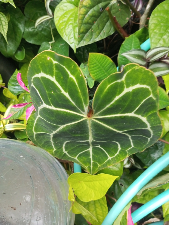 The scene, set in Khammam, India, displays a close-up view of dense botanical foliage. The central subject is a large, cordate (heart-shaped) leaf with a dark green lamina and prominent, reticulated white or pale green venation, consistent with an Anthurium species. Small, dark spots are visible on its surface, and its edges exhibit minor irregularities. Surrounding this central leaf are various other plants. To the upper right and left, numerous oval to heart-shaped green leaves, possibly Piper betle, are visible, some displaying minor blemishes. Below and to the left of the central leaf, a vibrant pink or fuchsia-colored leaf or bract is partially visible. Further back, striped green and purple leaves (likely Tradescantia) and other textured green leaves are interspersed throughout the frame. In the lower left quadrant, a segment of a clear plastic object, consistent with a cut-open bottle or container, is present. Its inner surface shows condensation or water droplets. Faint alphanumeric characters, appearing as "19101119," are discernible on the plastic surface. A bright cyan-colored plastic pipe or hose runs diagonally across the lower right portion of the image, with a section near its center wrapped in a narrow strip of pink fabric or ribbon. No human presence or direct action is observed.