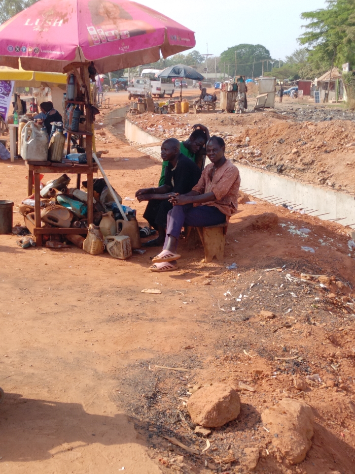 This image displays an outdoor scene in Television, Nigeria, characterized by reddish-brown earth and bright daylight