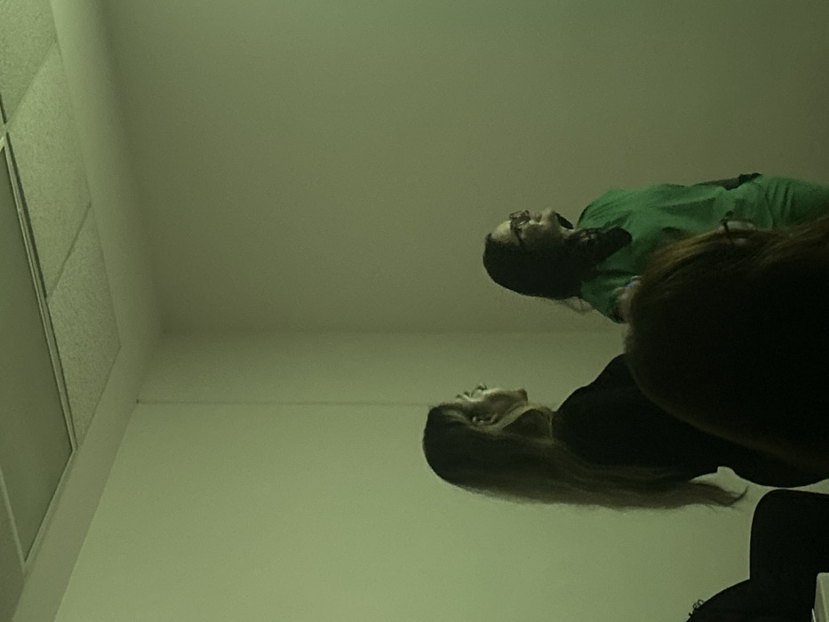 The image depicts an indoor scene in Interlomas, Mexico, characterized by a distinct green tint. Three individuals are present. On the left, a woman with long, light brown hair, wearing a dark top, is captured in profile, looking upwards and to the right. To her right, a second woman, wearing green medical scrubs and glasses, with dark hair, stands with her hands in her pockets, also looking upwards and to the right. In the immediate foreground, the out-of-focus dark hair and shoulder of a third person are visible, facing away from the camera, implying they are seated or observing. The background features plain, light green-tinted walls and a white drop ceiling with visible acoustic tiles. The visible women appear to be observing something not within the frame, likely a presentation or display. A partial view of a dark chair is visible on the far left.