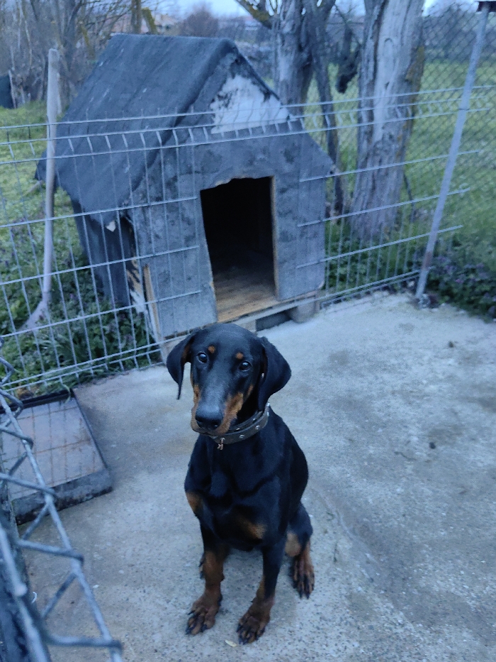 - "This image depicts a black and tan Doberman dog sitting on a concrete surface in an outdoor enclosure in Saedinenie, Bulgaria" by FM-tqeth1, licensed under CC BY 4.0