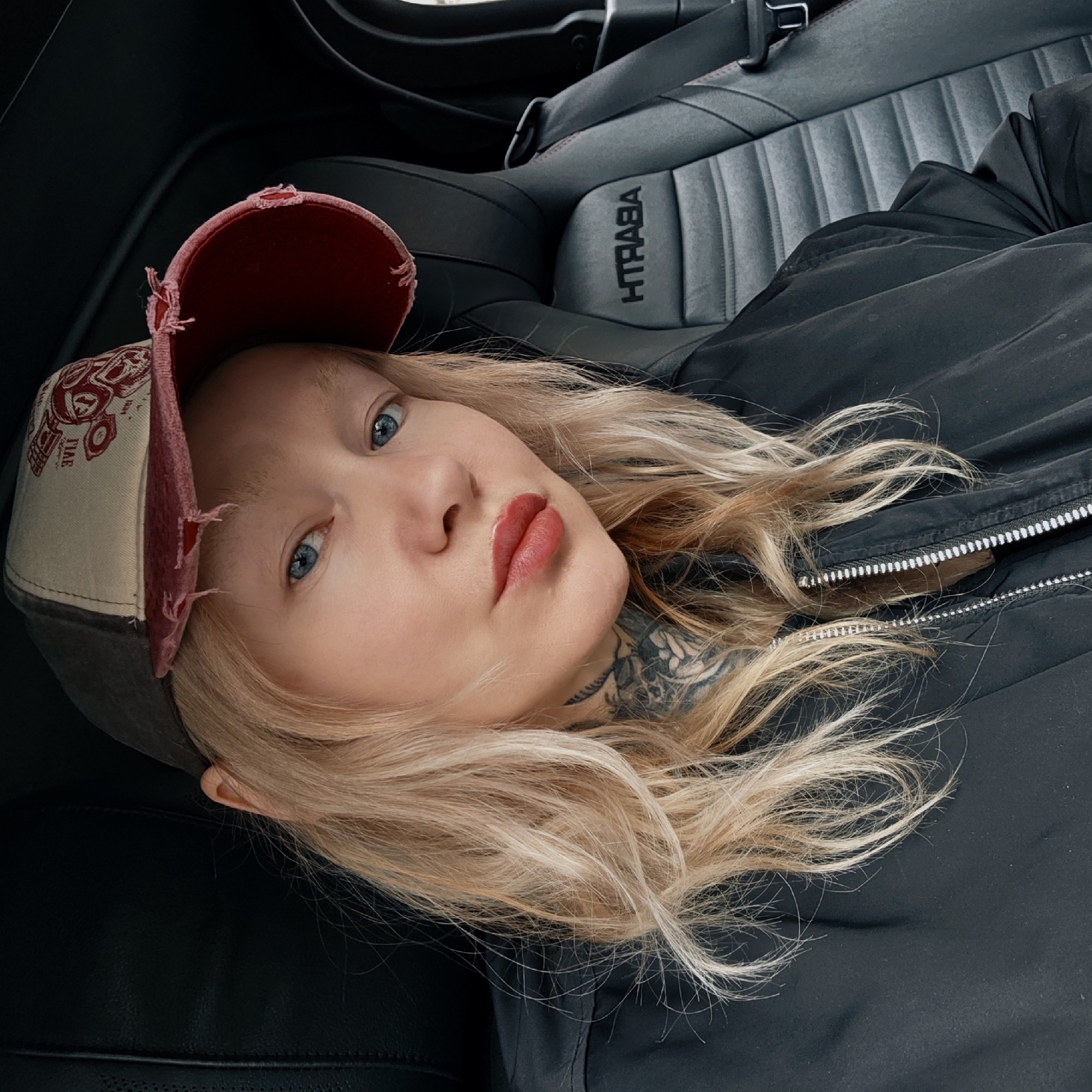 A blonde individual with blue eyes and light-colored eyebrows is positioned in a close-up portrait, seated within the passenger compartment of a vehicle in Saint Petersburg, Russia
