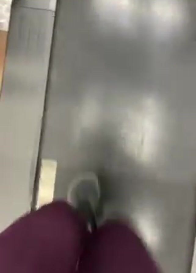 A person wearing purple leggings and gray shoes is walking on a gray treadmill. The treadmill has a gray console and a black cable coming out of it. The floor around the treadmill is light brown. The camera is positioned above the treadmill, facing down.