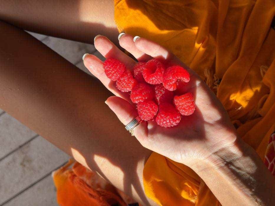 - "A close-up, overhead perspective shows a person's left hand cupped and holding approximately a dozen bright red raspberries" by FM-AxJLq1, licensed under CC BY 4.0
