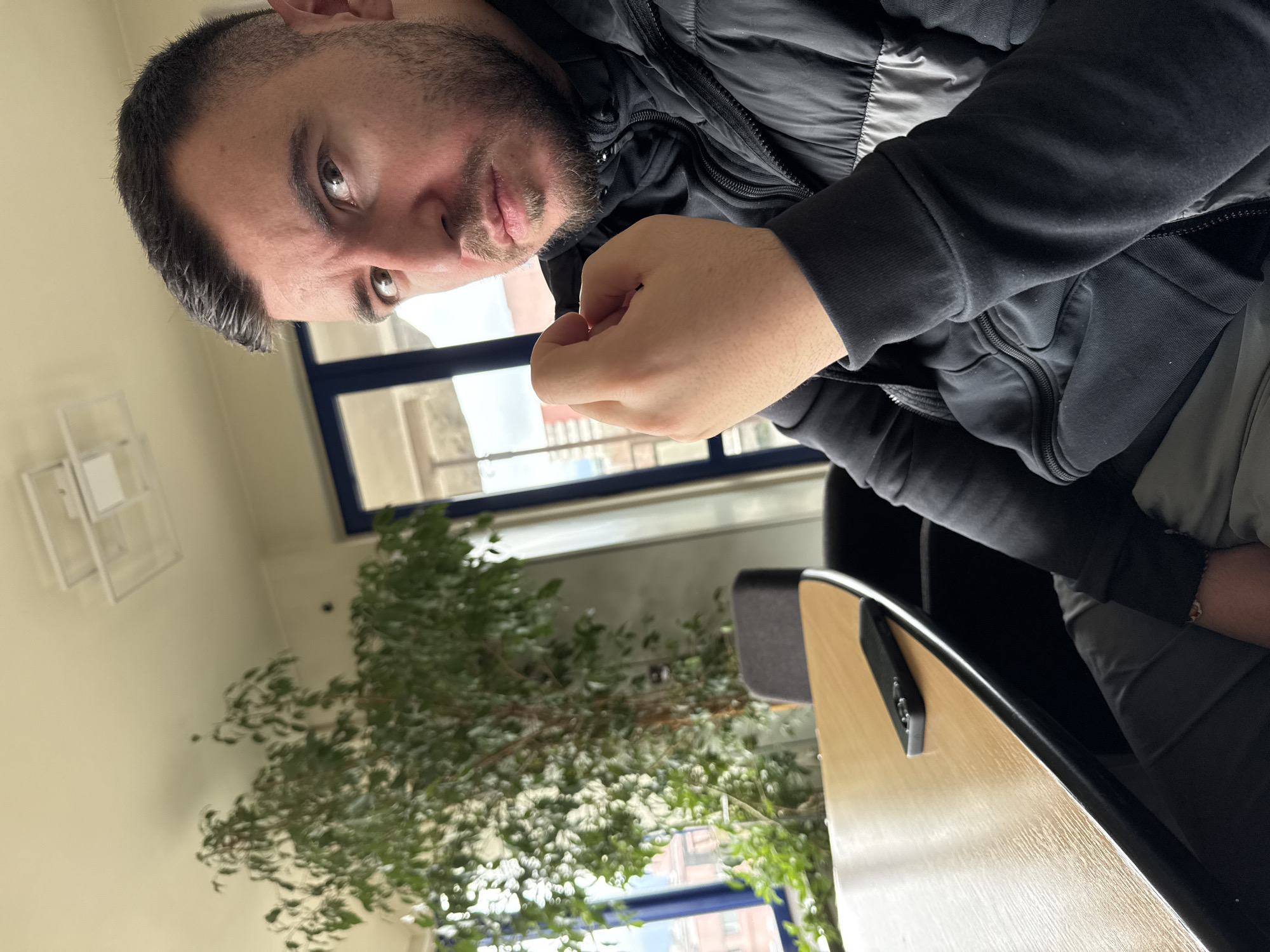 A man with dark hair and a beard is sitting indoors, wearing a black jacket