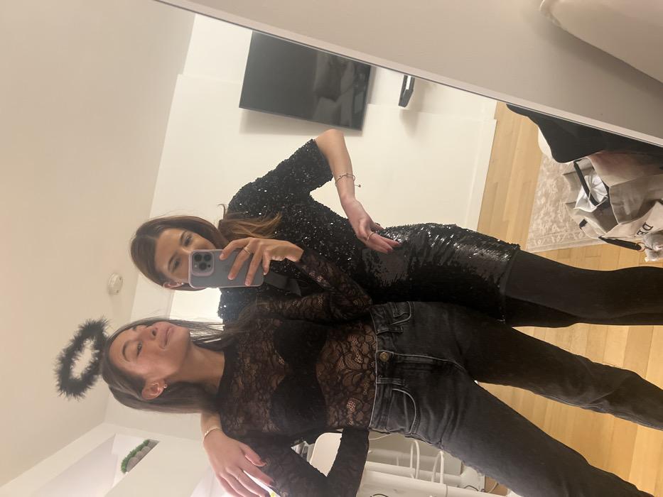 Two women pose in front of a mirror. The woman in front has an angel halo and wears a black lace top and dark jeans. Behind her, the second woman holds a phone, presumably taking a selfie. She's wearing a shimmering black mini-dress and black tights. A TV is mounted on the wall. The room is decorated with white walls and wooden floors.