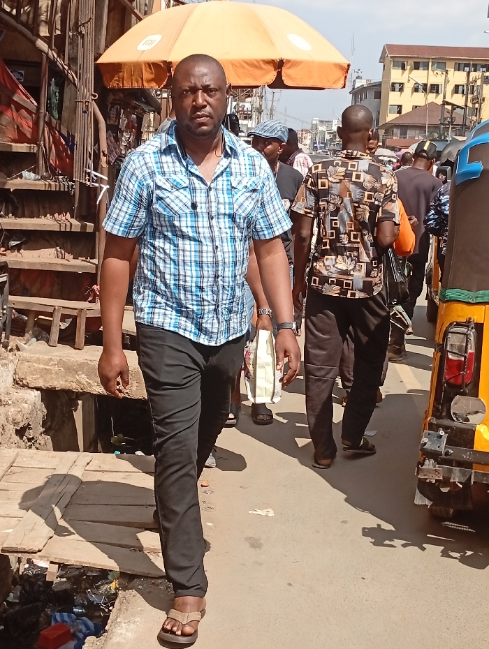 A man in a blue and white plaid shirt, black pants, and sandals walks towards the viewer in a bustling urban setting